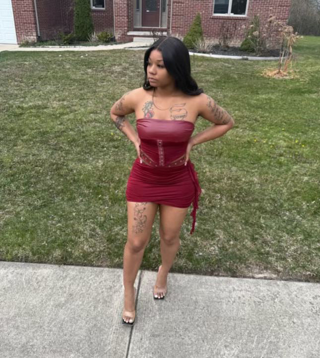 They said is burgundy with leather details skirt has stretch the back of corset has strings. outfit has silver details