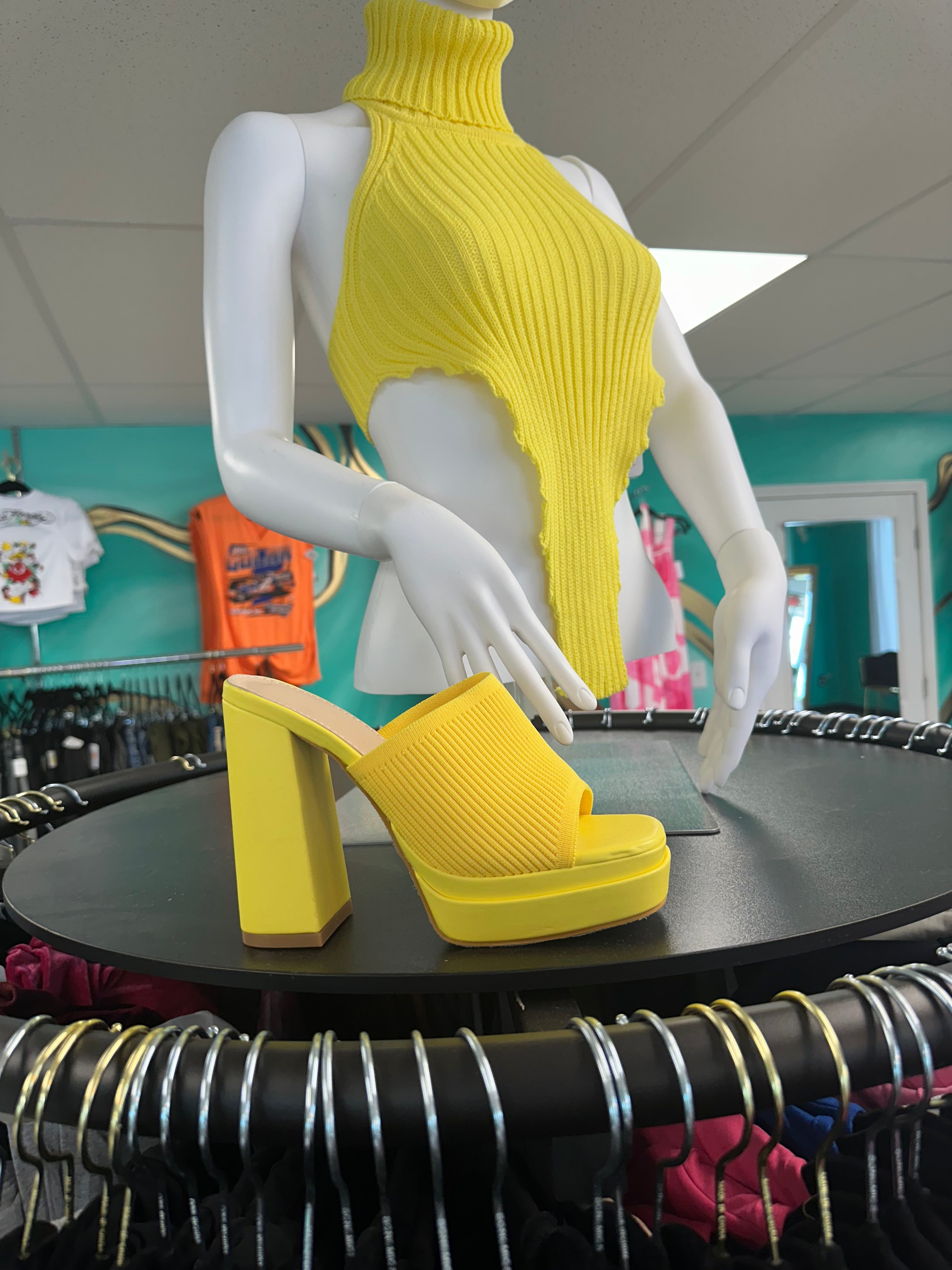 Our yellow block platform mule heels, meticulously designed to ensure a true-to-size fit.