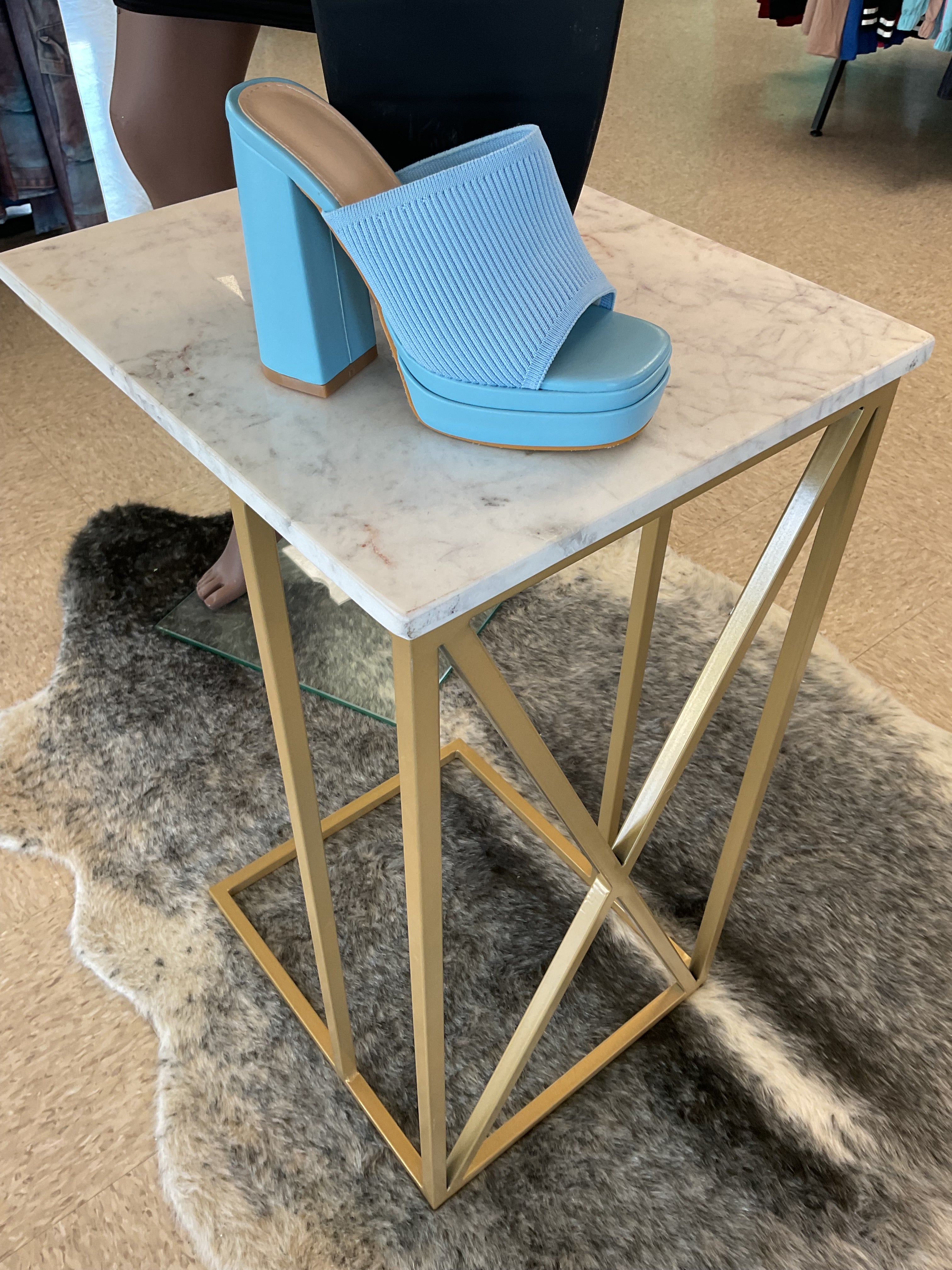 Our blue block platform mule heels, meticulously designed to ensure a true-to-size fit.