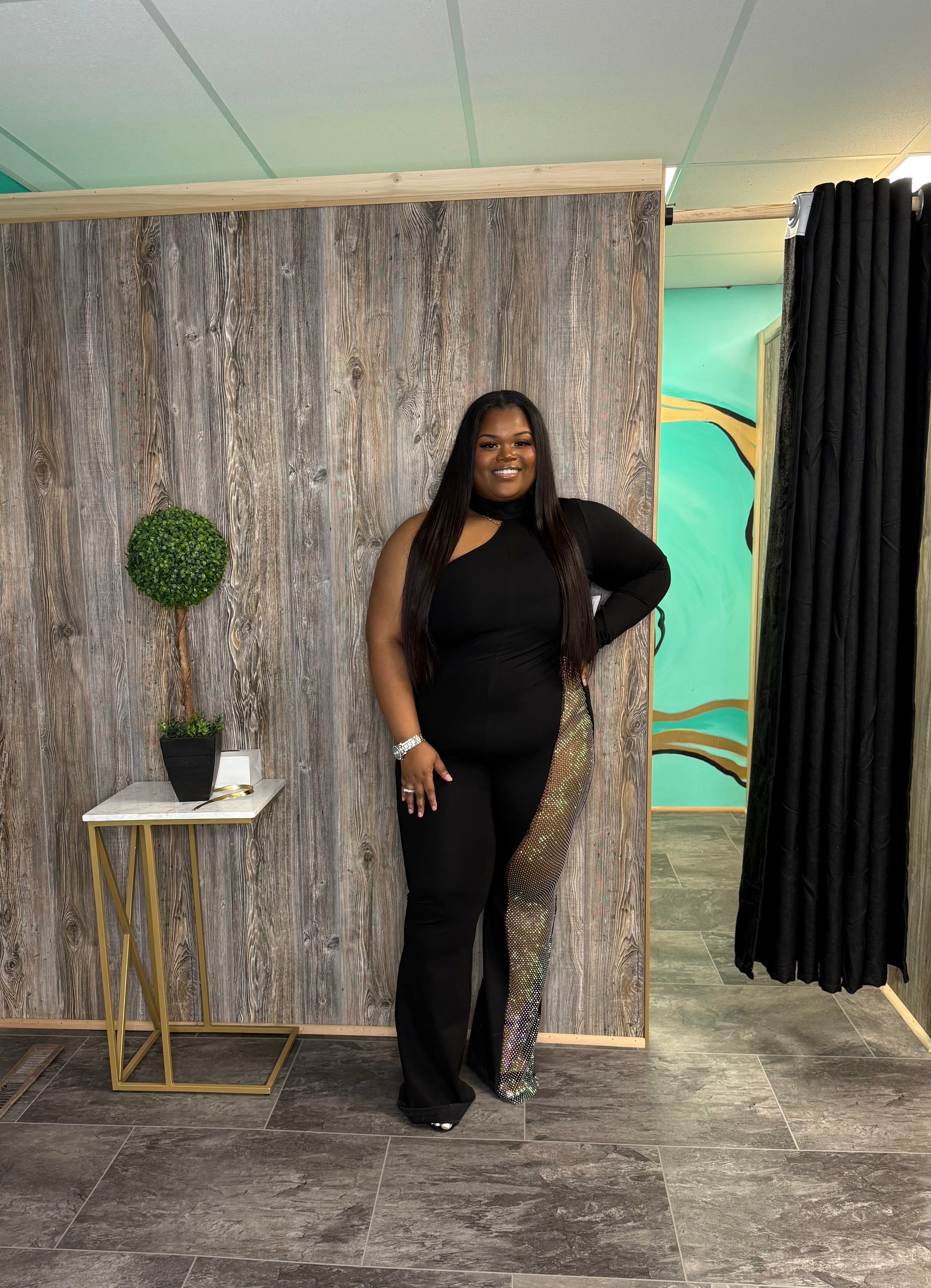 This black jumpsuit left leg has Iridescent rhinestones. Material is warm and thick With slight stretch.